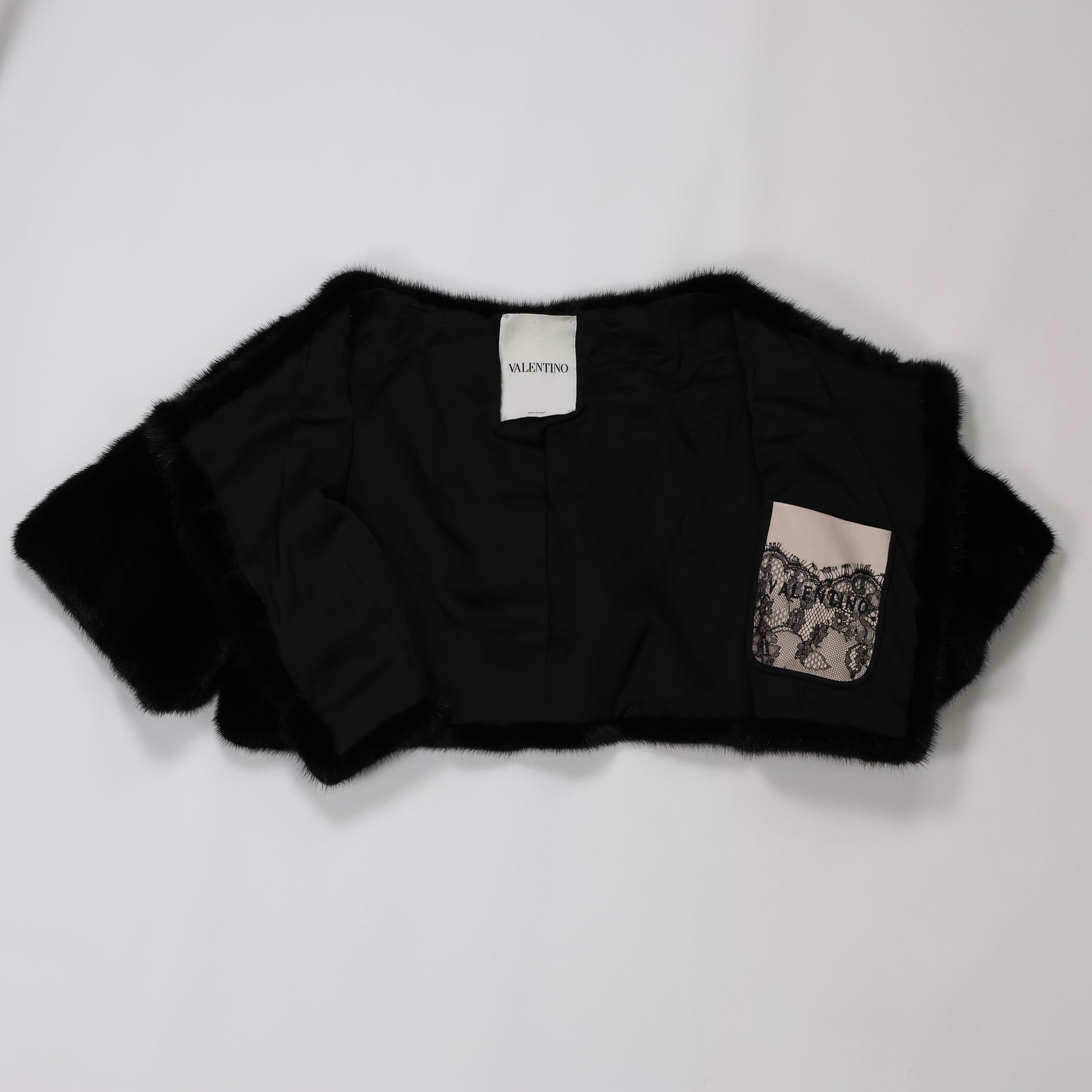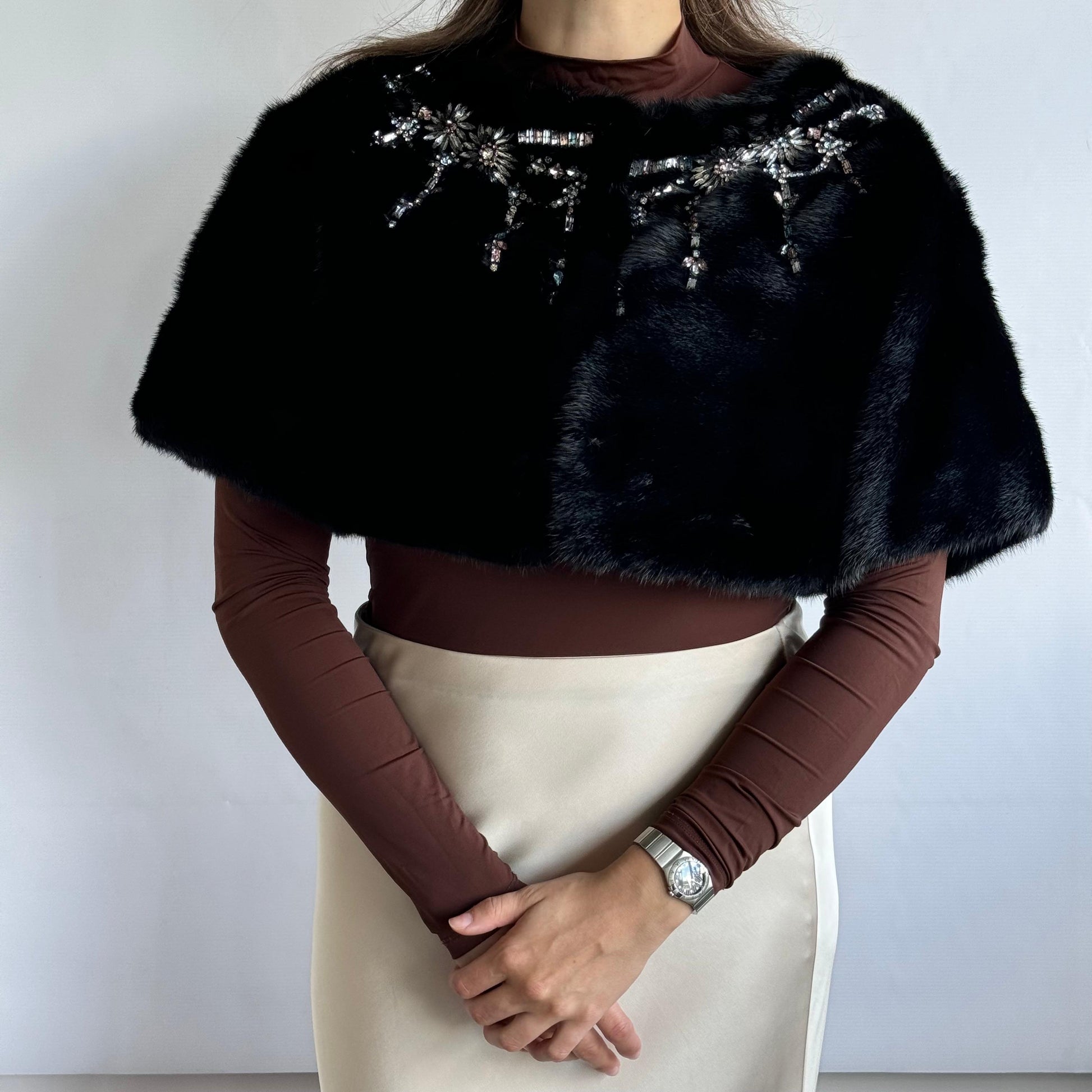 Valentino Black Mink Fur Capelet with Crystal Embellishments - Elegant Evening Wear
