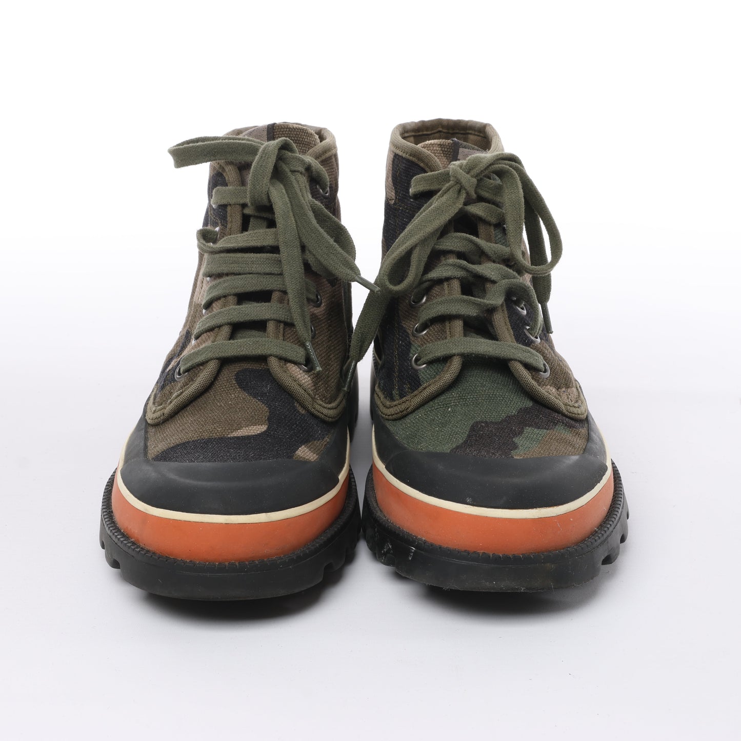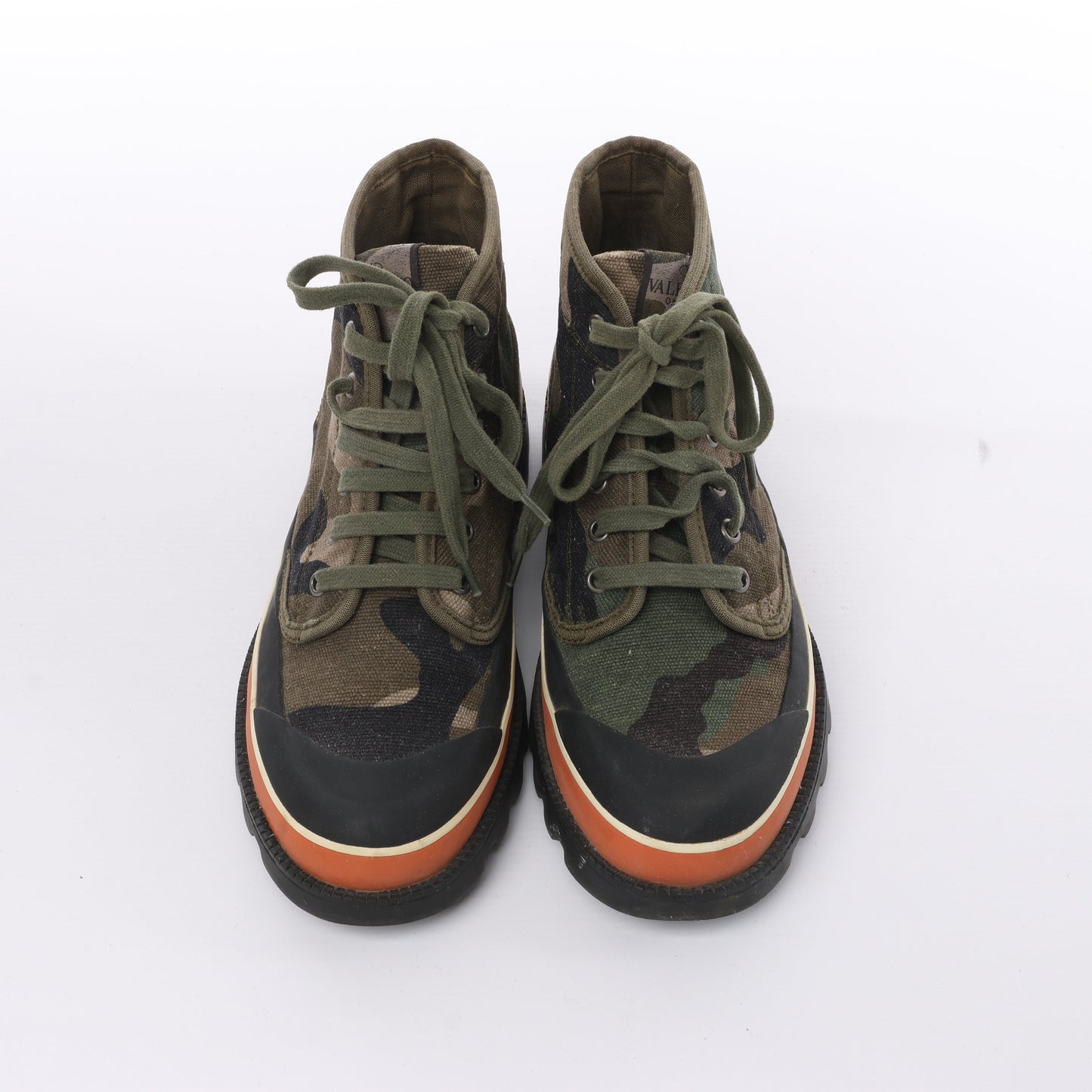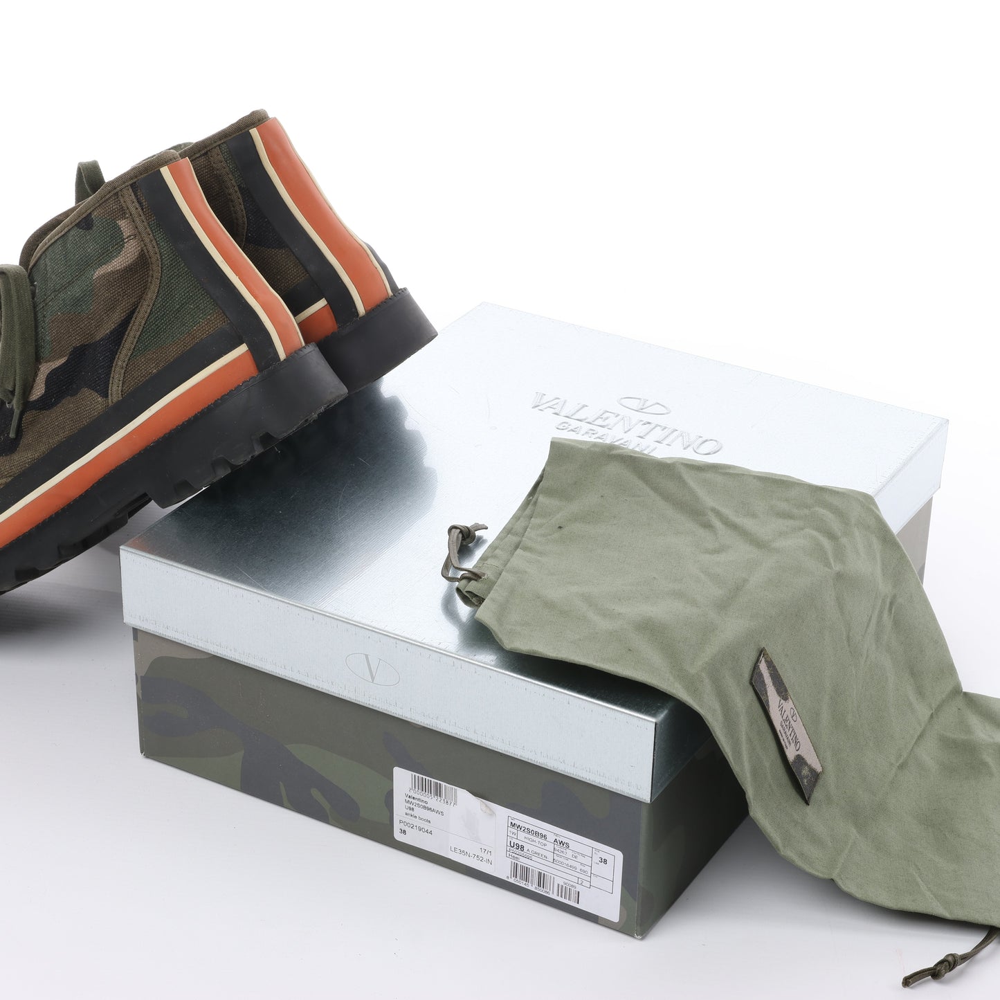 Valentino Garavani camouflage sneakers in khaki canvas, size 38 EU. With rugged lug soles and military-inspired print, these sneakers channel the brand’s edgy, street-meets-couture aesthetic made famous under Pierpaolo Piccioli’s bold vision.