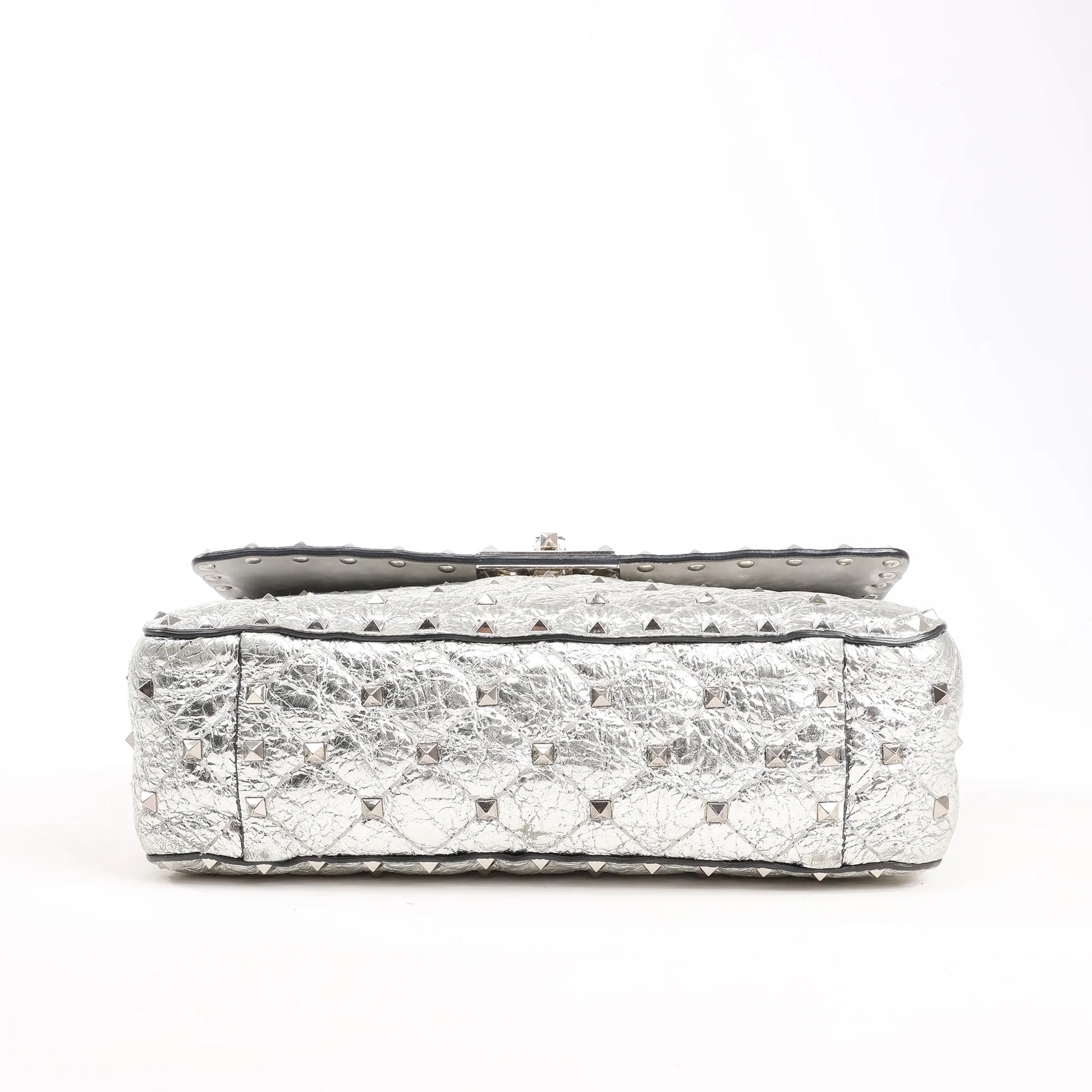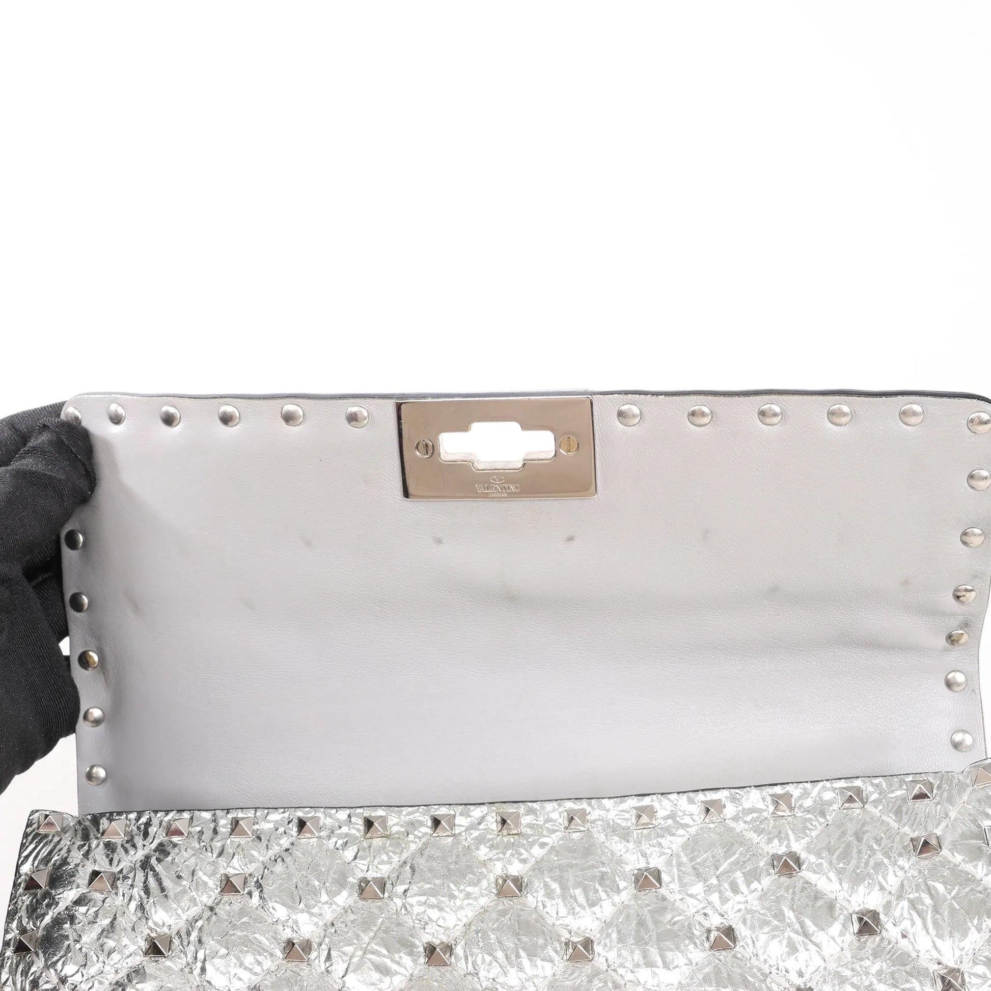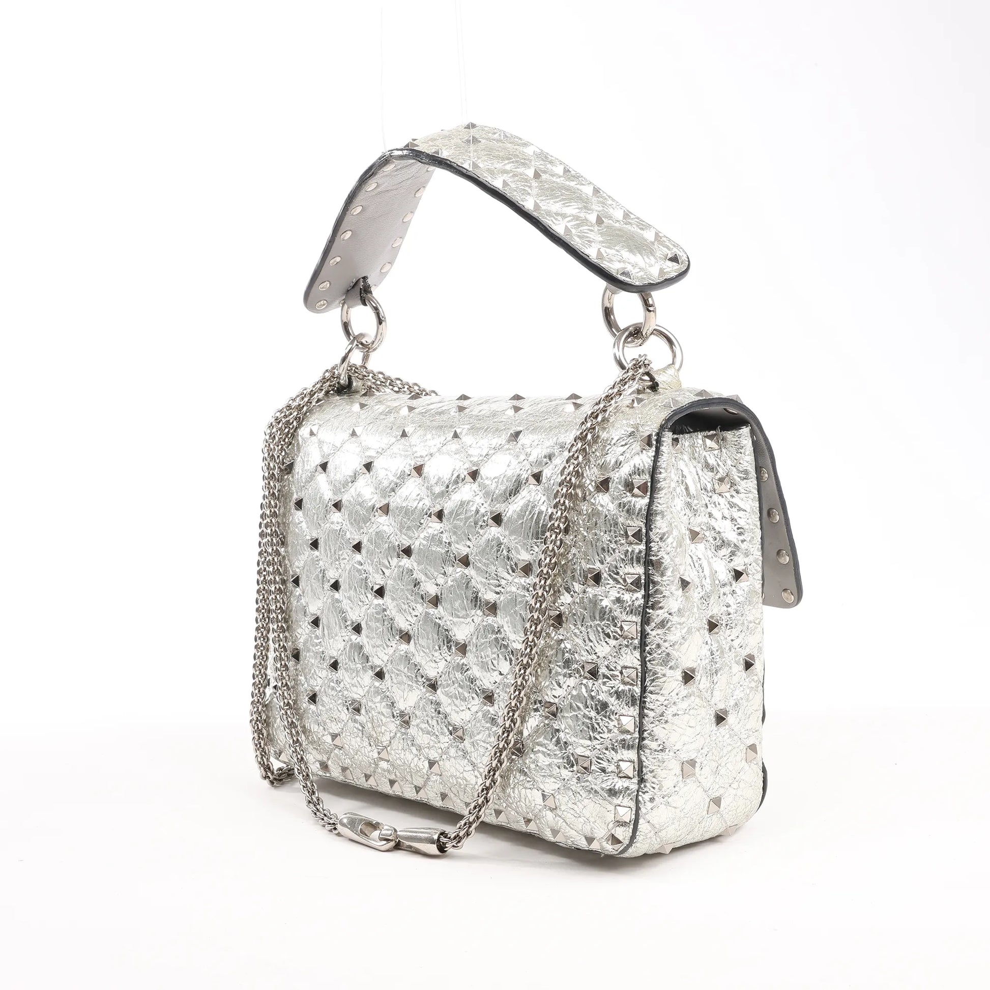 Shine bright with the Valentino Garavani Rockstud Spike 2Way Shoulder Bag in metallic silver. Crafted from quilted leather with iconic Rockstuds, this glam bag features a top handle and chain strap for versatile styling.
