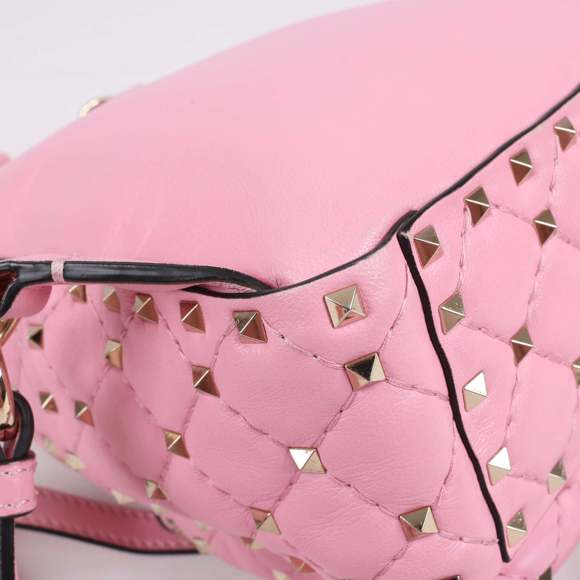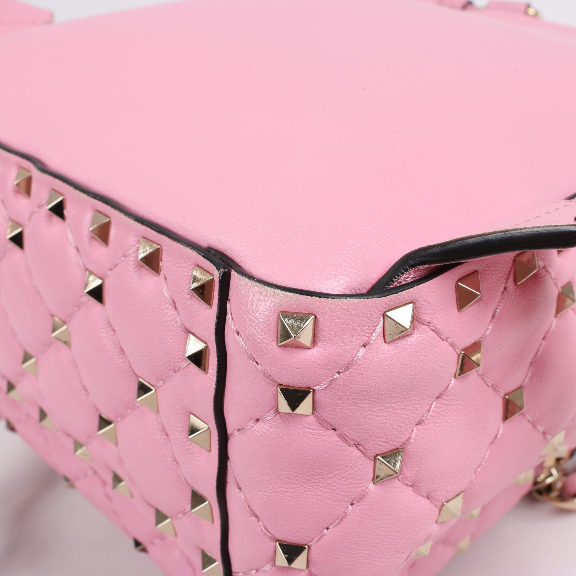 The Valentino Garavani Rockstud Spike Leather 2Way Backpack in Pink offers a bold, stylish statement. This quilted pink leather bag features signature gold-tone studs, adjustable straps, and a top handle for versatile carrying options, perfect for any fashion-forward look.