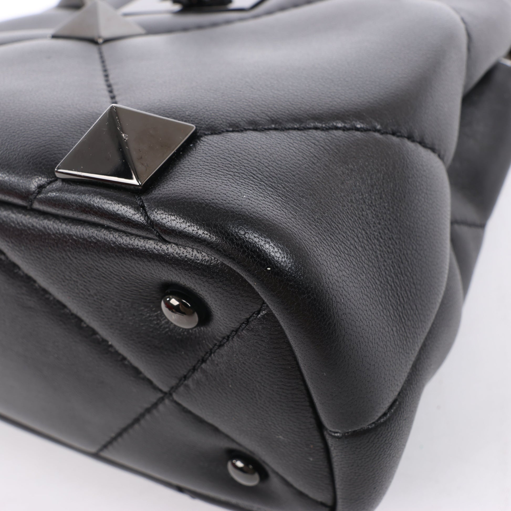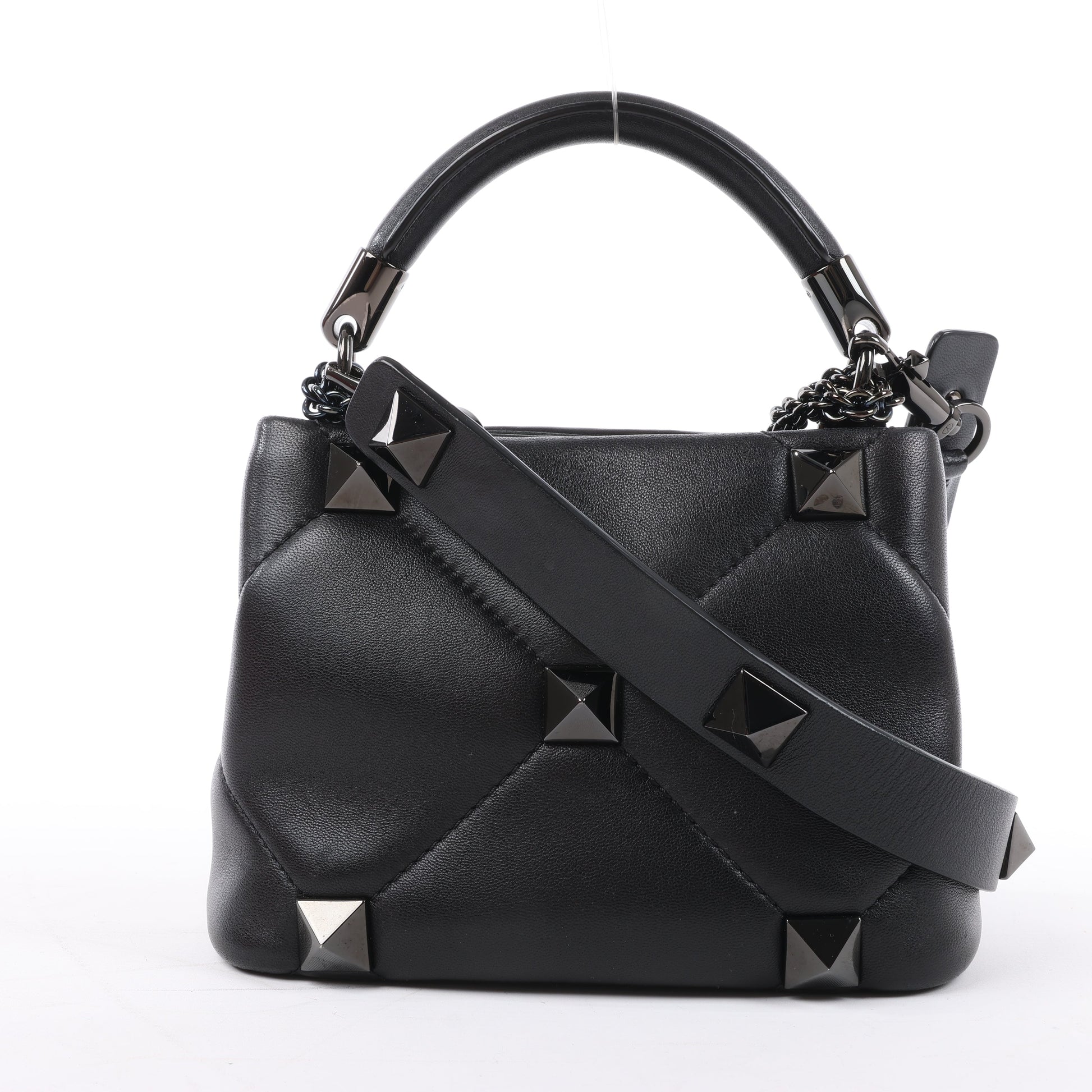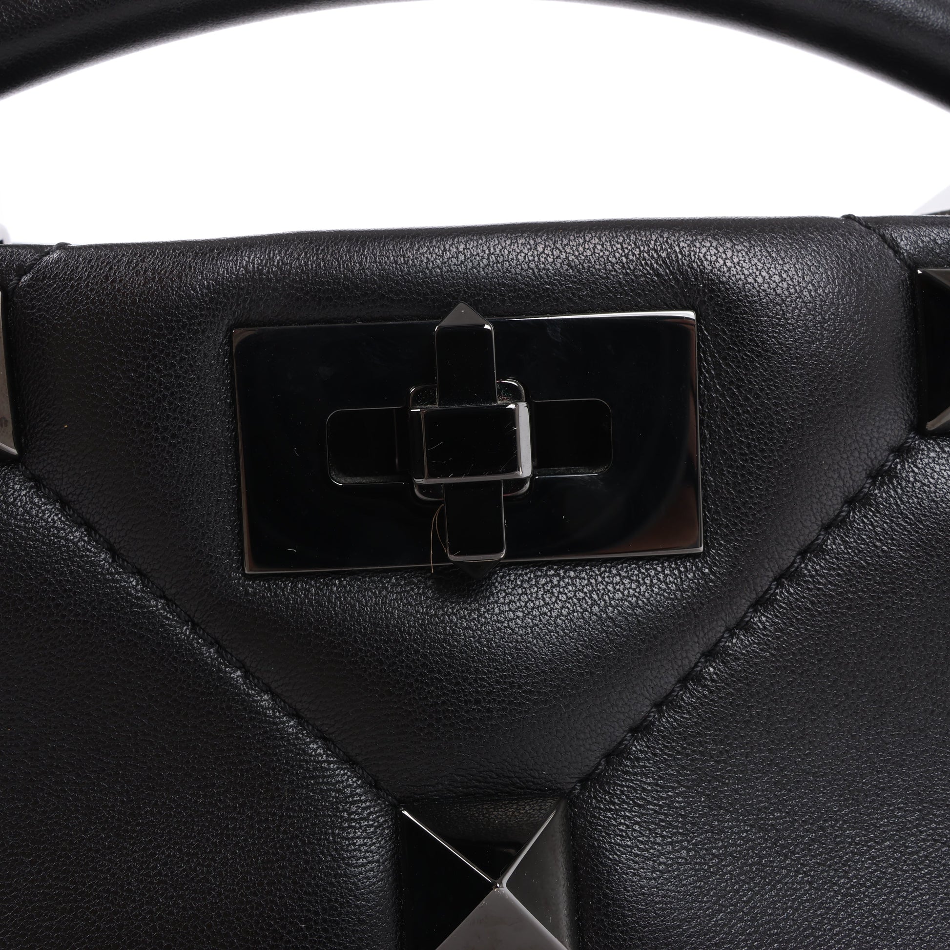 Valentino Garavani Roman Studs bag in black leather features bold pyramid studs, sleek gunmetal hardware, and a versatile 3-way design—carry it by top handle, chain strap, or shoulder strap for edgy elegance on any occasion.