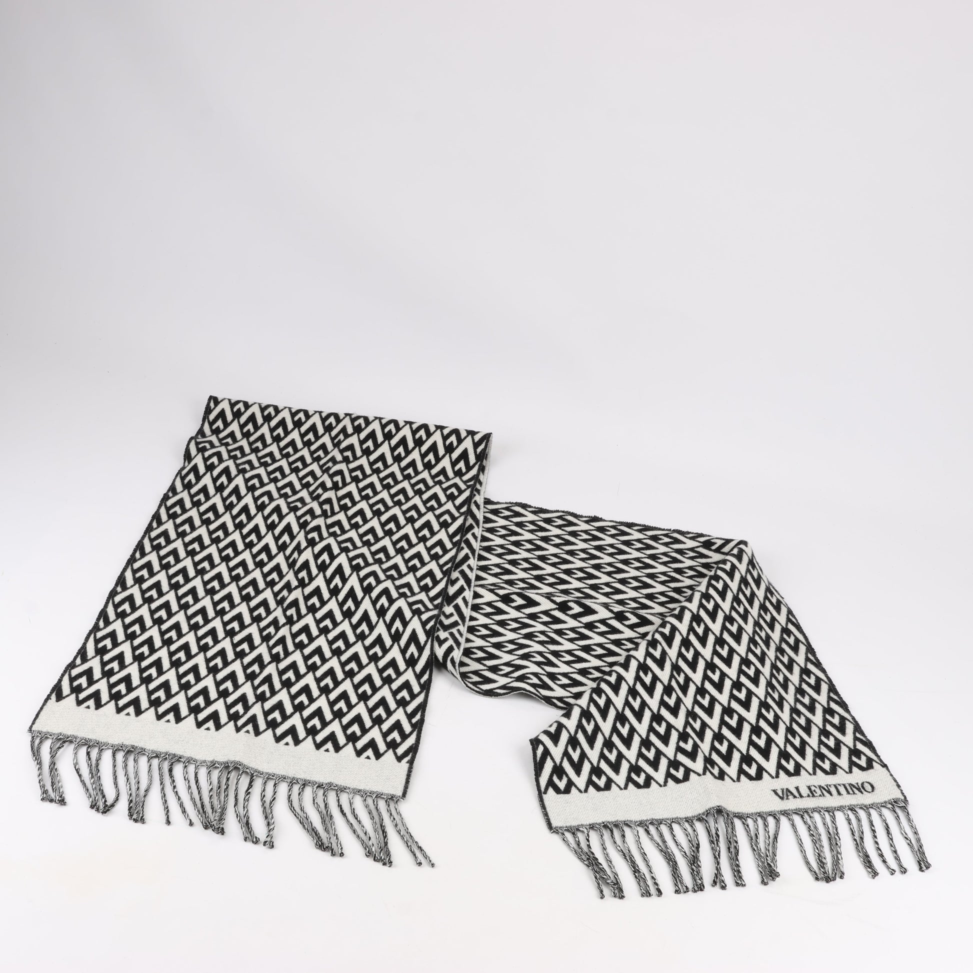 Wrap yourself in luxury with this Valentino Garavani V-Logo scarf. Crafted from a sumptuous wool and cashmere blend, it features a bold black and white geometric pattern, delicate fringe detailing, and the iconic Valentino logo. A chic and cozy statement piece.